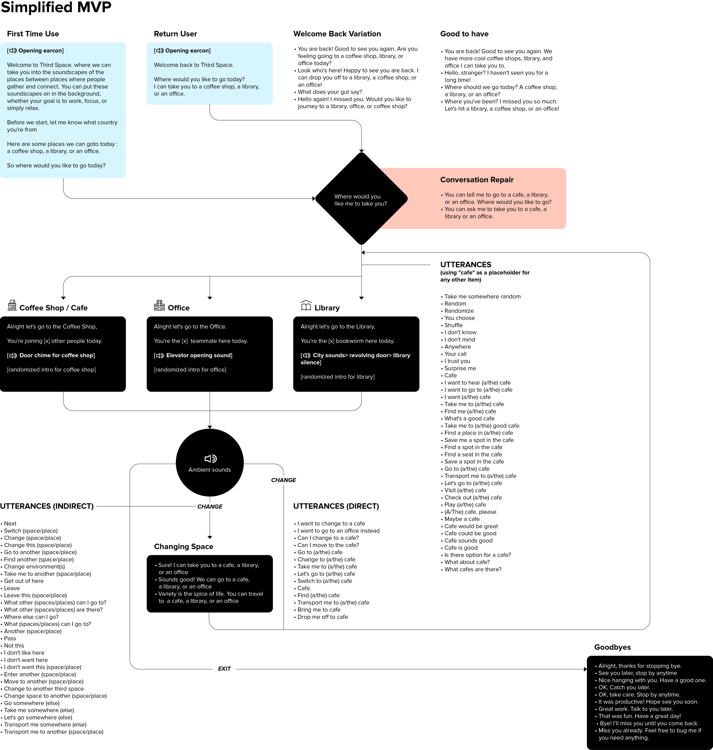 Throughout the process, we had been mapping out the flow of conversation between the user and the action. We had originally started with sample dialogue prior to our pivot. As the idea came to focus, our team went through several drafts before arriving at a final Conversation Map. We tried to accommodate as many different responses as possible, as is the brute-force nature of designing voice applications today. For example, accommodating for 100+ ways one might want to ask to go to a coffee shop.